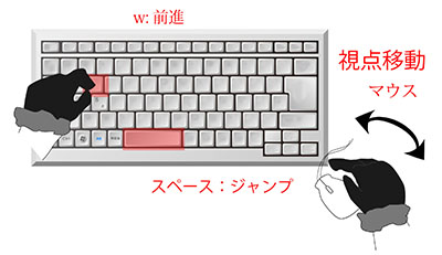 | Wキーで前進 Sキーで後退 Aキーで左側 Dキーで右側 Shiftキーを押しならがで歩き マウスで視点移動 |
