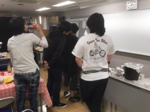 玉焼きを上手く調理できるよう試作中、お腹をすかせた学生たちが集まってきたり、
