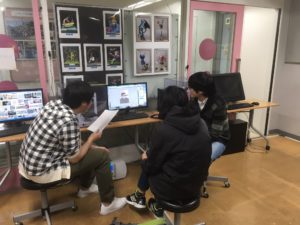 パソコンの前に集まってチラシの構成の相談をしたり、
