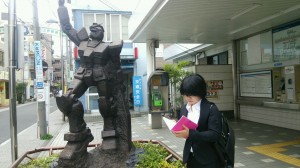毎回恒例のガンダム像の前で、「面接の受け答え」を最終チェック。