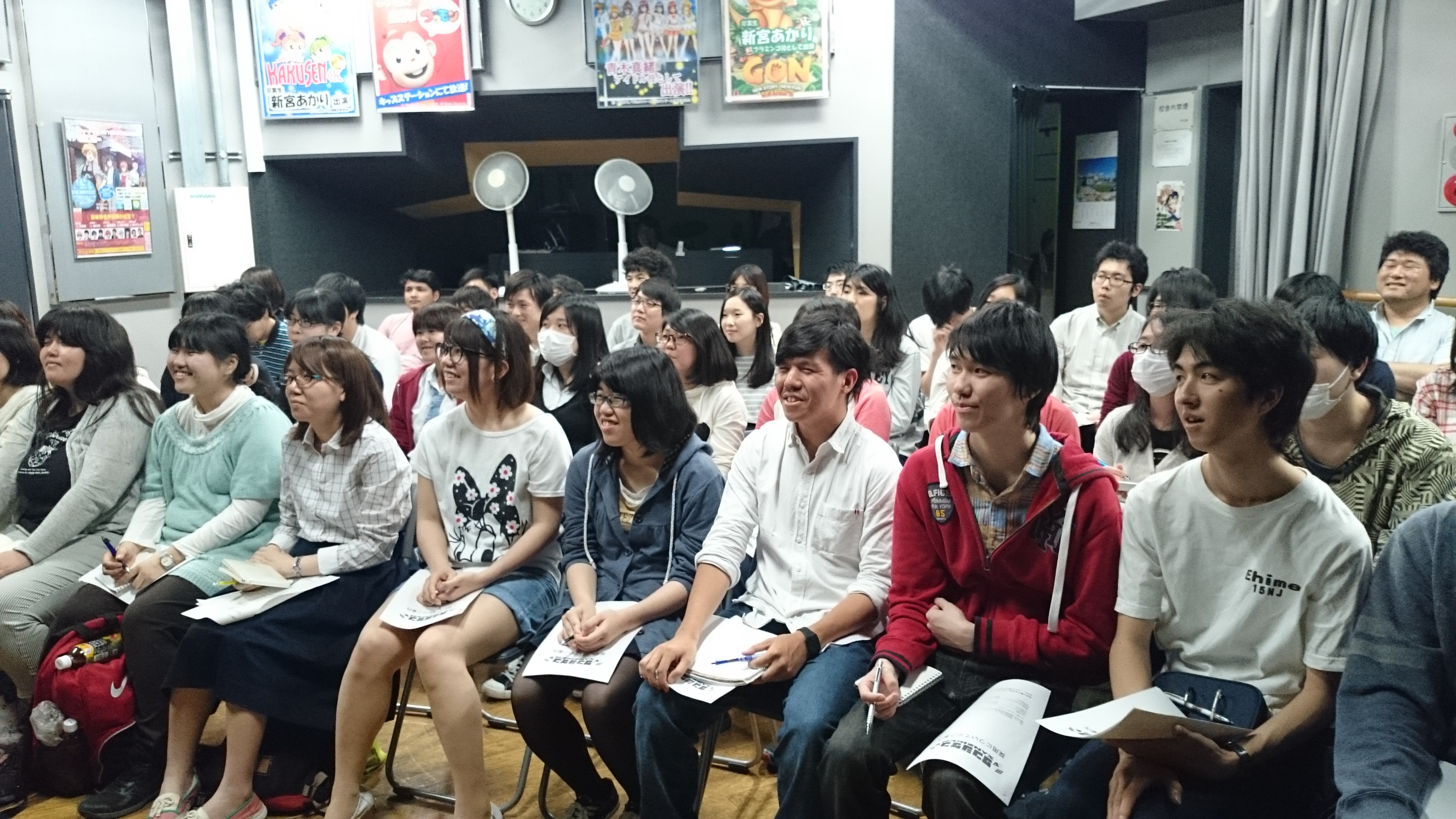 ホールに集合したアニメ学科の1,2年生は始まる前から緊張気味