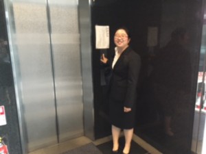 ↓エレベーター前では覚悟が決まり笑顔のフルちゃん