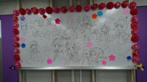 1年生が、ホワイトボードに絵を描いたり、可愛い飾り付けをしたり