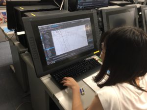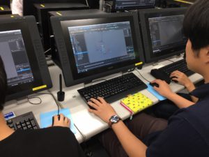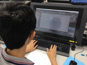 また、1年生の3DCG実習では3Dアニメーション制作の第一歩としてリグ(骨組み)の作成に取り掛かっていました。3Dキャラクターに骨を組み込むことができれば、自由に動かしたりアニメーションさせたりすることができます。夏休み明けでソフトの操作方法をすっかり忘れてしまった!なんていう学生がいたらと心配しましたが、こちらも全く問題なさそう(^^♪