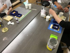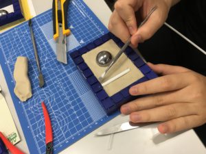 複製を取りたい物を半分油粘土に埋め、流し込む樹脂の通る道を作り、尚且つ表面がデコボコしないように実はすごい大変なのです。