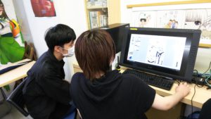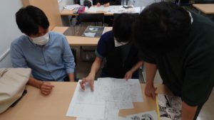 写真の様子は、原作者であるノベルス・シナリオの2年生と、作画担当であるコミックイラストの2年生が顔を突き合わせ、ミーティングを行っている場面です。