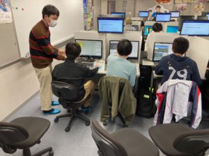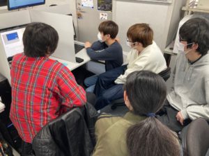 今週はゲームCGキャラクターコースとゲームプログラムコースの学生が数名ずつチームになり、まずはどのようなゲームを制作していくか話し合ったり、過去の学生作品をプレイしながらヒントを探したりと各チームそれぞれ動き出していました(^^♪