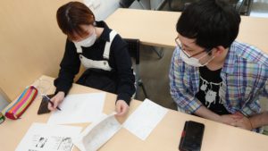 「原作研究」の授業の中で、ノベルス・シナリオ学科の学生が発案、制作したネーム(マンガの設計図のようなもの)をマンガ・イラスト学科さんに渡し、実際のマンガを描いてもらいます。
