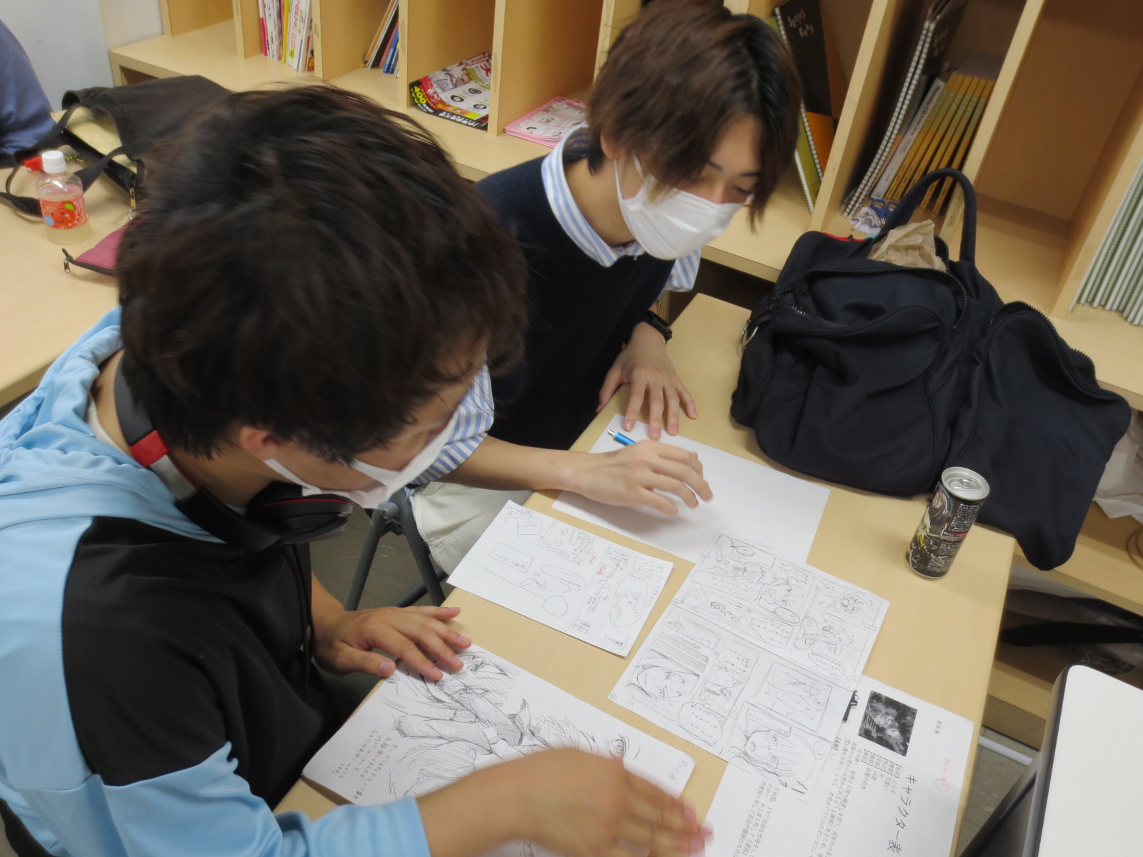 ノベルス・シナリオ学科の「原作研究」という授業で学生が発案、制作したネーム(マンガの設計図のようなもの)をマンガ・イラスト学科さんへ渡し、実際にマンガを描いてもらいますshine.gif