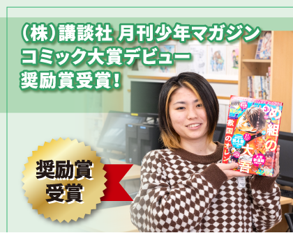 私はデジタルアーツ東京に入学してからマンガを描き始めました。マンガの基本知識やプロット・ネーム等、1から学べたことがすべて力になっています。受賞作品は何とか完成させた作品だったので、雑誌掲載を勝ち取ることができるとは思っていませんでした。今後は読者の印象に残るようなホラーマンガにチャレンジしたいと思っています。