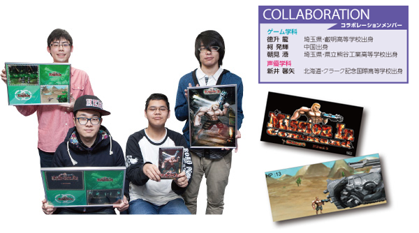 マッチョなキャラクターが暴れまわる、横スクロール型のアクションシューティングゲームを制作しました。メンバーそれぞれの趣味や好みを超えて頑張りました。主人公はどこかで見たことがあるようなデザインにならないように、たくさんの案の中から絞り込み、さらに修正を重ねました。大変だったのはミスをみつける作業で、完成度を上げるために少ない時間で全力を尽くしました。キャラクターの声は、声優学科の学生が担当し、力強い声の演技で臨場感を高めました。