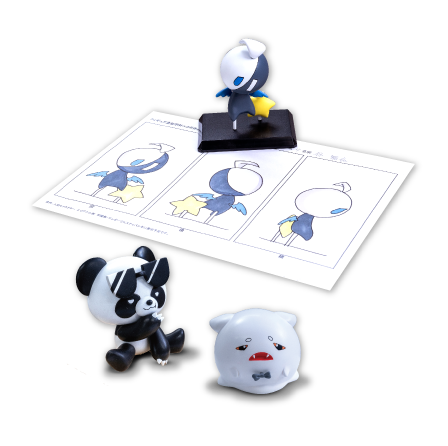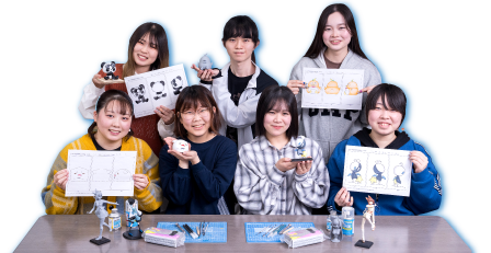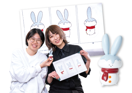 イラスト学科の学生がデザインしたオリジナルキャラクターをフィギュア原型学科の学生が立体化します。平面図であるイラストから立体キャラクターとして魅力的に見せるテクニックが求められます。イラストレーターの希望も汲み取って素材・手法を選択し、高い完成度で仕上げています。