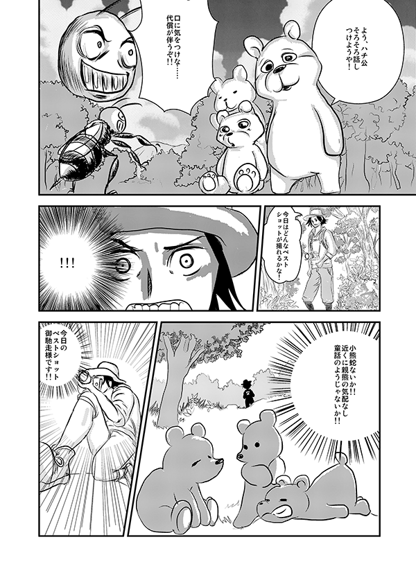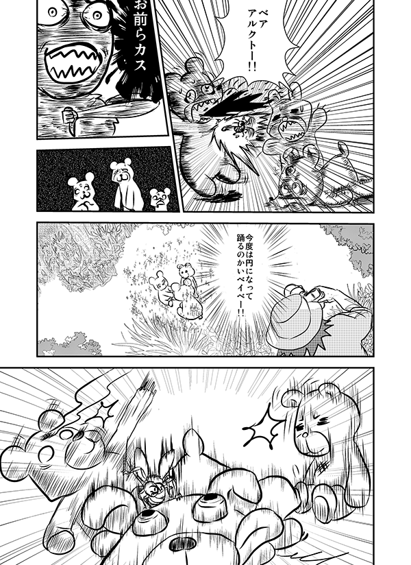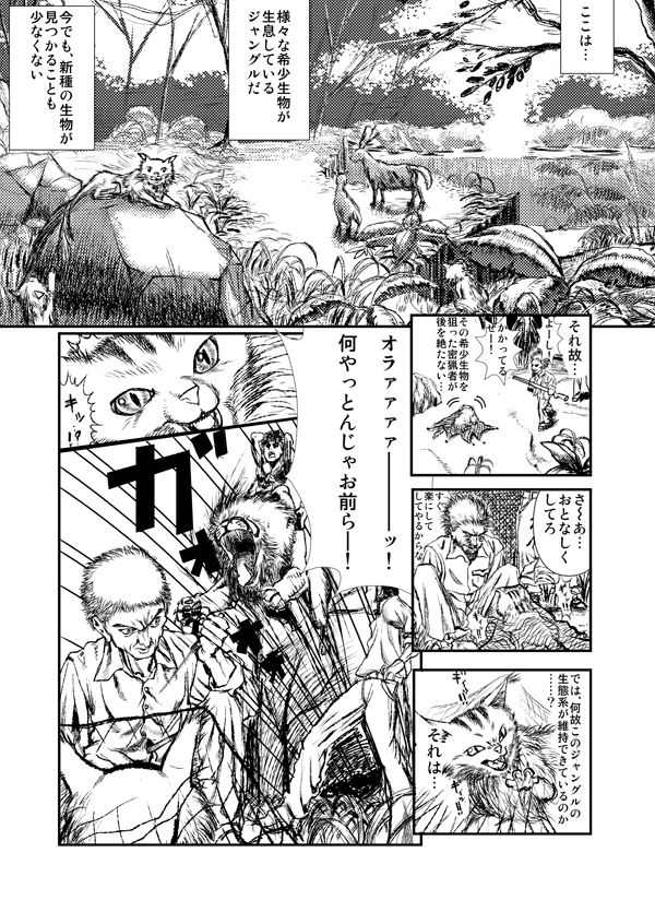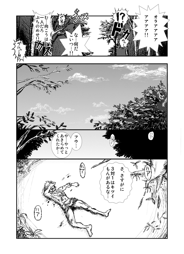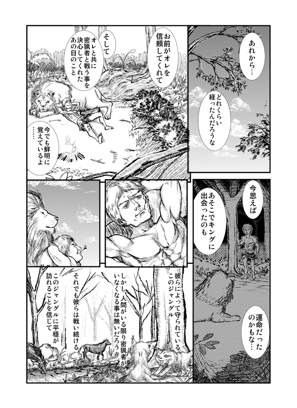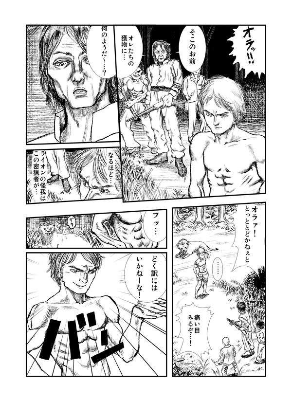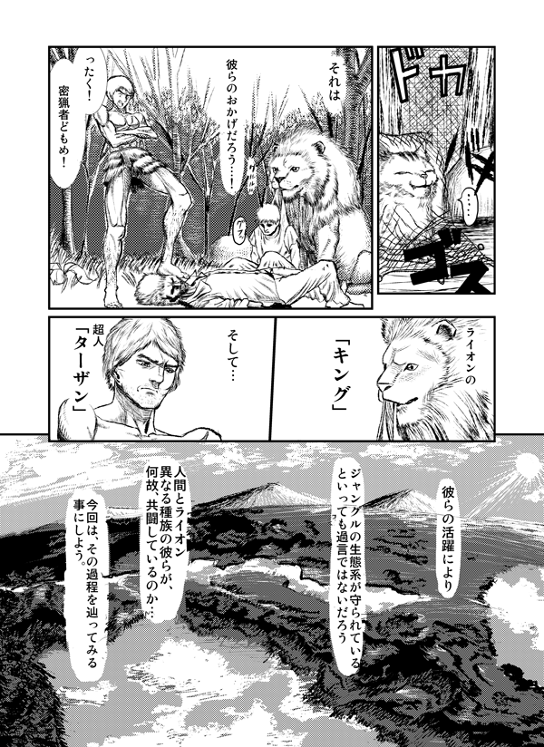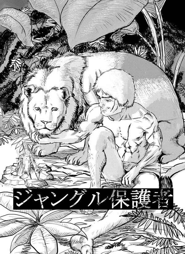 ジャングル保護者のターザンとキングの出会いを描きました。いろいろとキャラクターの名前をパクッていますが、あたたかい目で見てください。